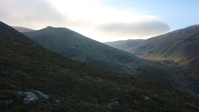 I was still enjoying myself. By the time I reached the broad stony summit 850mtrs), things had taken on frozen look, as all the rocky were coated in hoare frost. The wind was quite strong by now so I didn't delay before setting off towards the next top of the round Caherconree at 837 metres. There is a drop of 150 metres to reach the wide col and down here I was briefly under the cloud. Dingle Bay could be seen below me, and it gleamed silver in the low sun. I was soon on the very nice ridge that rises towards Caherconree and before long I could see the cairn loom out of the mist. The wind was now very strong indeed and I was at times being blown sideways as I curved around the rim of the corrie. I suspect it was a combination of lack of concentration, the mist, and the very strong wind, but I somehow contrived to do a complete 180 turn, and walk in entirely the wrong direction back past the cairn, and down the wrong side of the mountain. I descended to about the 700 metre contour and once again emerged under the cloud and I knew that I had gone very wrong. I had of course neglected to bring a map and compass, but I knew the lay of the land, and I climbed to once again reach the summit of Caherconree, and this time I paid more attention to my route and descended correctly. The strong wind continued all the way down until I was back below the 300 metre contour. It was a super relief when it eased as I was getting quite cold, especially my hands as I only had light gloves on. All and all not my finest hour.